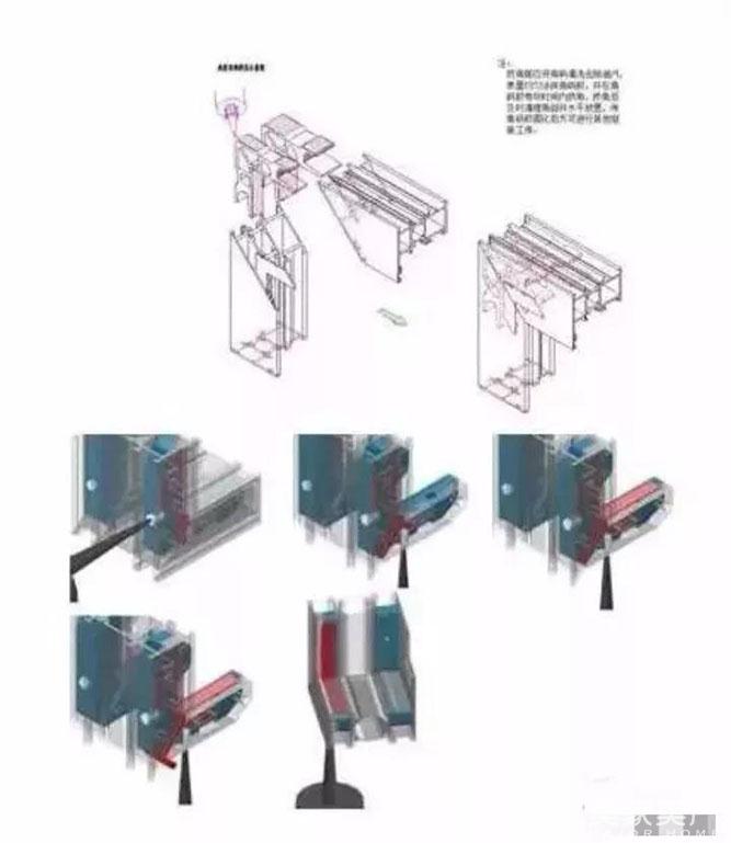 通过对欧洲系统的研究发现,系统门窗的组角连接采用的是专用的铸铝角码配以空心不锈钢销钉+注胶。这种组角工艺包含了两项特殊技术:一是膨胀拉紧固定技术,二是注胶密封技术。每个铸铝角码是由两瓣铸铝件构成的,当不锈钢空心销钉打入后,两瓣铸铝件会自动胀开,加上角码销钉孔和型材销钉孔的配合公差,将两根45 度拼接的型材牢牢拉紧、固定。固定完成后,接下来要通过销钉的注胶孔向角码内注胶。三维透视图中红色部分显示的就是组角胶在角码内流动的路径。注胶完成后型材45度拼接处,从腔体内部完全用胶密封住了。角码与型材腔体之间的缝隙也完全封死了。