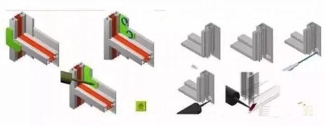 普通铝合金门窗对这个部位一般不处理,或者只是象征性的在拼接处抹点玻璃密封胶,可以说基本上没有起到密封的作用。系统门窗在这个部位采取了特殊的措施,安装了一个带凹槽的不锈钢或铝合金卡件,一方面补强了薄壁处的连接,避免拼接处开缝;另一方面,通过在不锈钢卡件和型材之间注胶,完全保证了拼接处的密封。