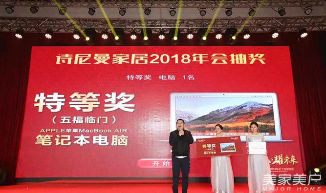 活动当晚,诗尼曼还为全场家人们准备了丰厚的礼品,洗衣机、冷暖空调、液晶电视、滑板车,更有特等奖“五福临门”送出苹果笔记本MacBook air,由辛董亲自抽取。
