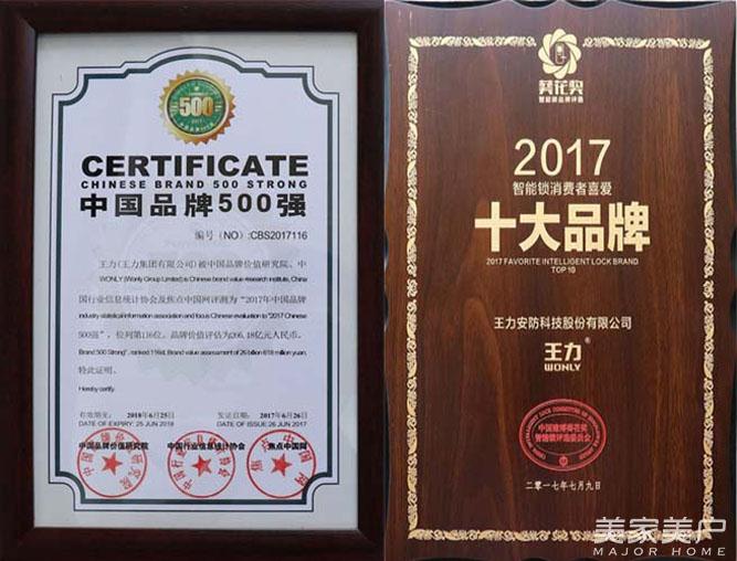 2017年获得了中国品牌500强、智能锁消费者喜爱十大品牌、腾讯家居2017影响力品牌奖、中国房地产2017年度采购峰会竞争力十强(门业类)等诸多奖项。奖项的存在,证明了媒体、行业、开发商对王力安防产品和品牌的信任。