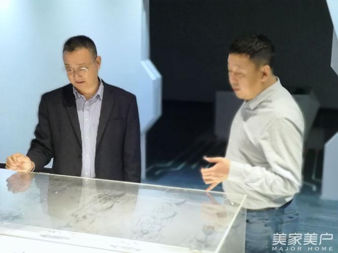 硕贝德智能锁总经理任占荣(右)陪同广东省门业协会徐生(左)参观产品展厅