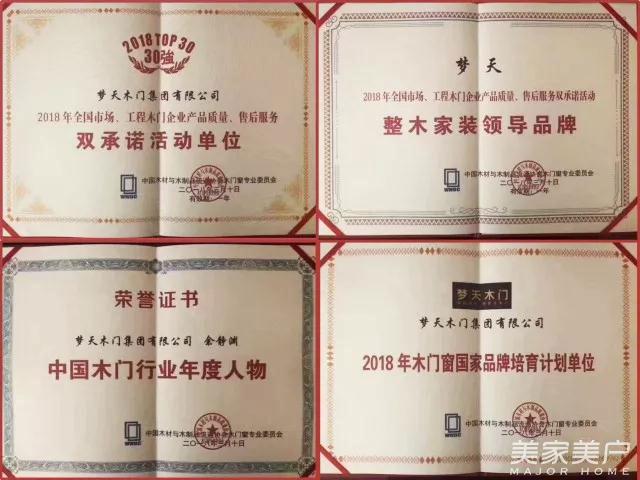 梦天木门荣获“2018年全国市场、工程木门企业产品质量、售后服务双承诺活动单位”、“整木家装领导品牌”、“木门窗国家品牌培育计划单位”三大奖项;