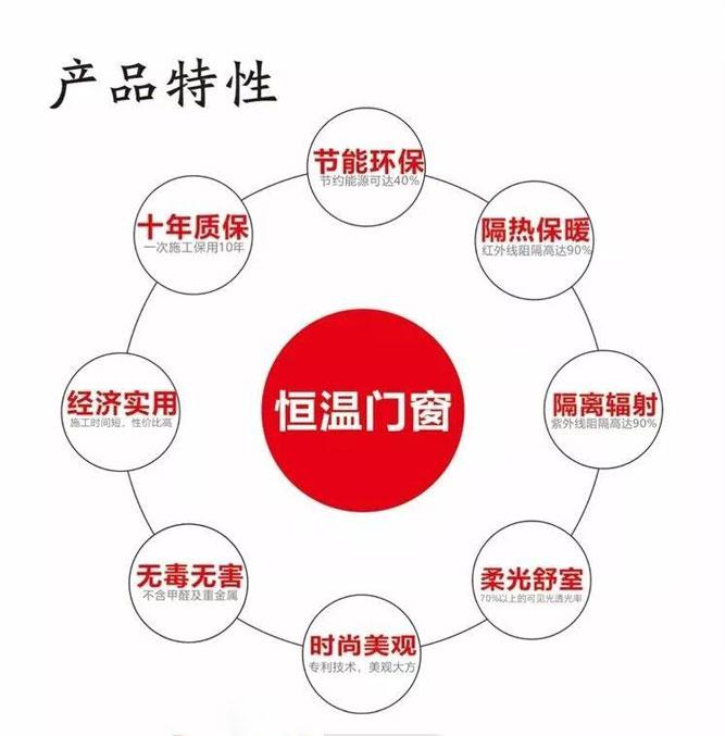恒温门窗玻璃节能套装采用本公司联合研发的一种具有特殊光学性能的纳米节能材料。在保证良好的可见光透光率的同时具有优异的阳光控制和保温隔热特性。无需外界能源即可根据环境温度变化自行调节,自然起到"冬暖夏凉"的作用。只需三小时,给您一个健康舒适的家!