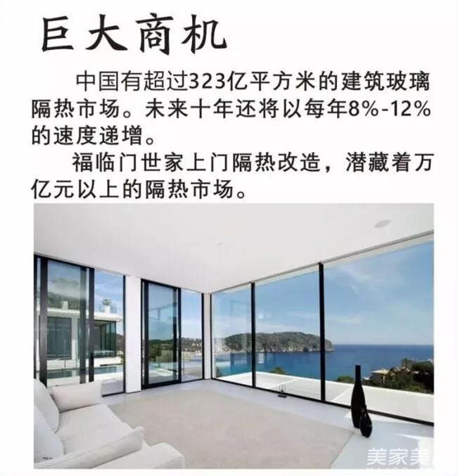 福临门节能事业部,为节能隔热而生。节能产业是千年大计万年常青。主要针对现有建筑的玻璃进行隔热隔紫外线改造。这个市场蕴藏着6万亿的市场份额,并且每年以36%的速度增长,符合政策导向,国家鼓励,社会需求。欢迎有志之士加盟全新的行业,选择新跑道,走差异化路线,从经营产品转向经营服务,服务无法代替,创造非凡人生。节能减排功在当代,利在千秋。