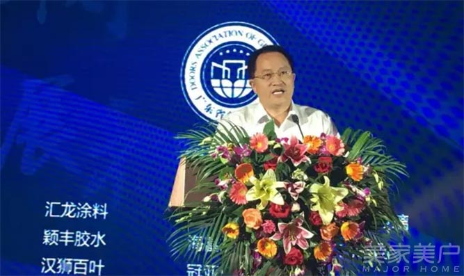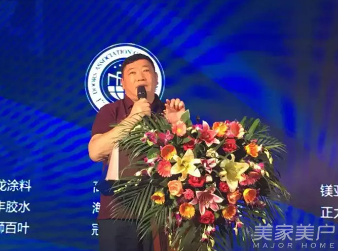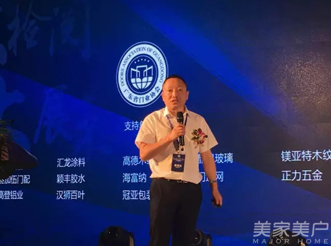 广东省门业协会常务副会长、广东汇龙涂料有限公司董事长陈辉庭在会上致辞。他说:“今天迎来今年最火爆的广东省门业协会换届选举大会和中国门业豪门盛宴。我相信,只有门企不断接受检验,不断升级,才能有大的发展。”