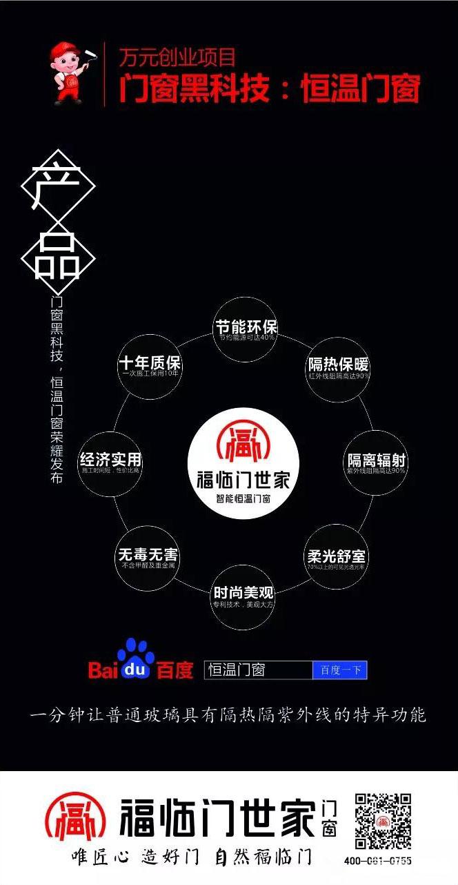 一分钟让建筑原有的普通玻璃具有隔热防晒保暖隔紫外线的特异功能!冬暖夏凉,隔绝紫外线,让房子的家居用品老化时间延长一倍,提高使用寿命,延长装修翻新时间,该项目被同行前辈称为2018建筑黑科技。福临门世家恒温门窗玻璃节能套装一经上市,被今日头条,腾讯,新浪等一百多家知名媒体采访。