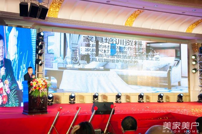 皇庭门业提出要做全屋定制,皇庭集团开发设计总监朱发兵先生上台对皇庭集团整装设计理念发布作讲解,主要从家具的材质及木作生产、家具尺寸、材质、工艺细节、木饰面与金银箔的表面漆工艺、家具后期维护与保养四个方面进行分享。同时指出要做好整装,需要做好经销商和厂商的对接工作。