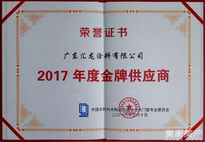 由中国木材与木制品流通协会木门窗专业委员会举办的中国木门30强双承诺活动是木门届最权威的颁奖盛典,获奖品牌都是国内木门届最具实力和影响力的品牌,本次颁奖盛典,包括梦天、TATA、润成创展、万家园、大自然、一木等引领行业的品牌悉数获得最高级别的表彰,在发布的30强名单中,我们再次发现,有一半品牌都是汇龙涂料的合作伙伴,这也进一步夯实汇龙涂料作为中国木门涂装专家的地位。鉴于汇龙涂料长期为木门行业作出的贡献,组委会也特别为汇龙涂料颁发了“2017年度金牌供应商”奖。