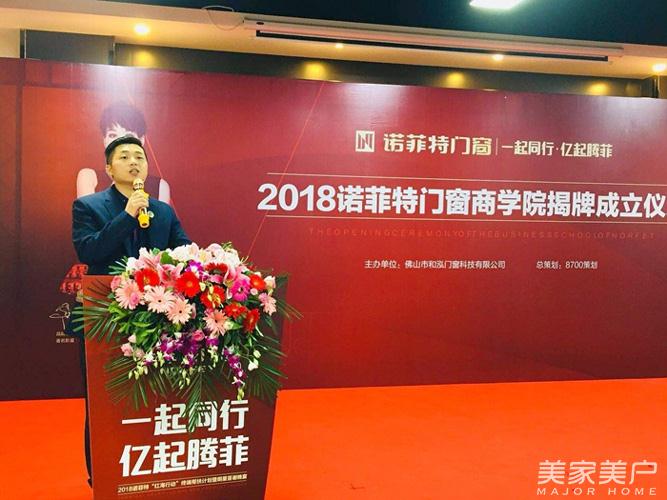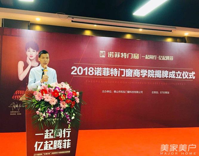 在活动热烈激昂的气氛下,诺菲特董事长余永山上台致辞。余董致谢了在场所有来宾及经销商家人们,并且阐述了诺菲特商学院的今后定位与发展愿景:人才炼金炉、营销武器库、知识孵化器三大系统。余董还补充道商学院校训为“思变求进,开拓创新”,以此校训鼓励所有员工及经销商家人们思考、创新,放飞梦想起航!