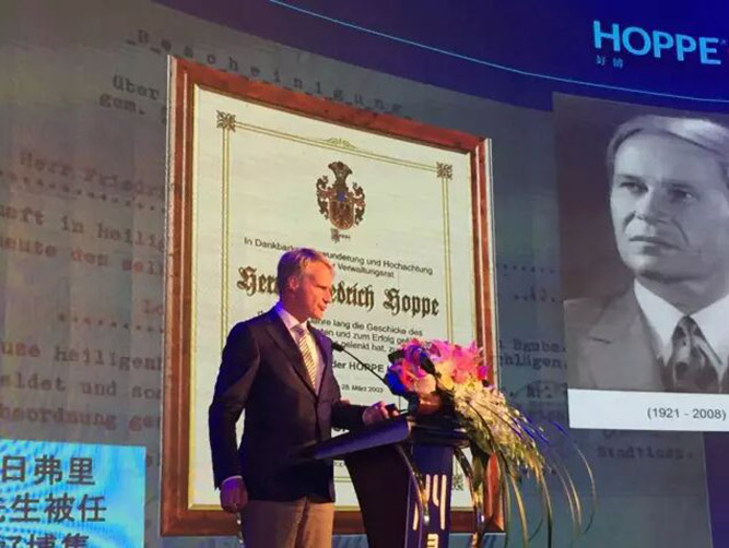 随后,德国好博(HOPPE)集团总裁Herr Christiph Hoppe 致辞。他从好博的成立到今天的一个发展历程讲述了好博的企业以及今天取得成就。