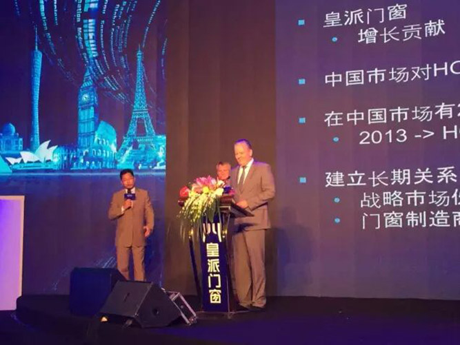 接着,德国好博(HOPPE)集团HOPPE全球销售与市场总监Herr Markus Haick致辞。他说:“我们很高兴皇派使用我们的产品,皇派在中国门窗已经是领导者。我们坚信好博和皇派 能有非常好的发展。”