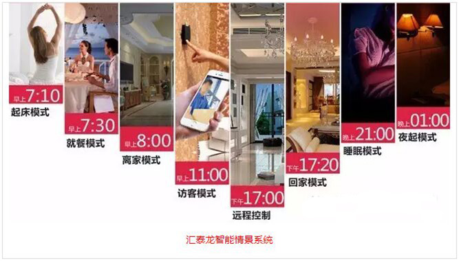 汇泰龙智能家居系统能设计各种各样的场景,只为让你的每一天生活变得更美好,汇泰龙智能家居系统通过多年的技术积累与研发,不仅仅只是家中的电器、家具甚至门锁简单的连接起来,更是将软硬件结合,让家中的家具互联互通,成为一个有机整体,整合智能门锁、智能安防 、智能控制、智能空气监测、智能照明、智能场景六大功能模块,实现对整体人居环境的灯光、音乐、家电、安防、能源等各种情景的控制和联动,为用户提供全系统解决方案,让美好的智能生活触手可及。