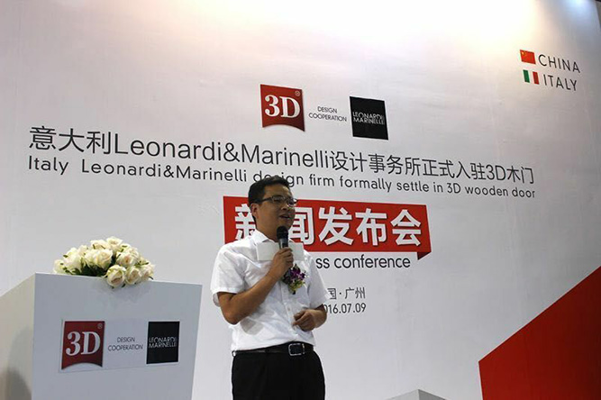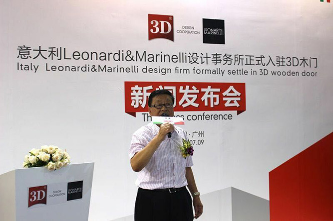 7月9日,《意大利Leonardi&Marinelli设计事务所正式入驻3D木门》新闻发布会在第18届中国广州国际建博会期间隆重举行。中国木材与木制品流通协会木门窗专业委员会会长张国林、全国工商联家具装饰业商会执行秘书长张仁江等行业领导、3D木门高层、3D木门设计师Leonardi、艺术总监Marinelli,以及现场数十家行业媒体共同见证了这一伟大时刻。