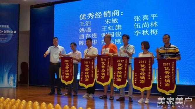 为表示对经销商家人的感谢,新帝豪高层领导特上台为经销商家人颁发锦旗和奖杯:优秀经销商奖、中国好老板奖、店面颜值奖。他们是优秀的经销商老板,也是公司最真诚的合作伙伴,今后,新帝豪也将与更多的优秀经销商一起携手共赢,抢占更宽阔的市场。