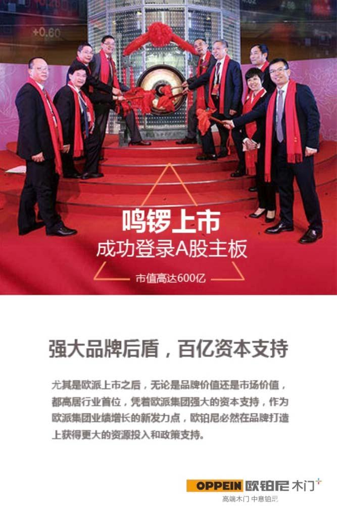 欧派上市之后,无论是品牌价值还是市场价值,都高居行业首位,凭着欧派集团强大的资本支持,作为欧派集团业绩增长的新发力点,欧铂尼必然在品牌打造上获得更大的资源投入和政策支持。欧铂尼木门代表欧派集团诚邀您加入欧派冠军俱乐部,抓千亿商机,共赢未来!
