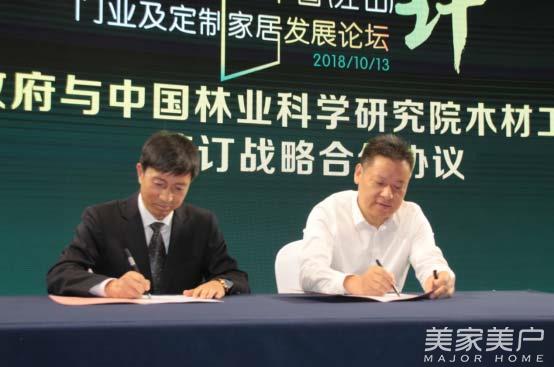 江山市人民政府副市长张志军(右)与中国林业科学研究院木材工业研究所副所长吕斌分别代表江山市人民政府与中国林业科学研究院木材工业研究所签订战略合作协议