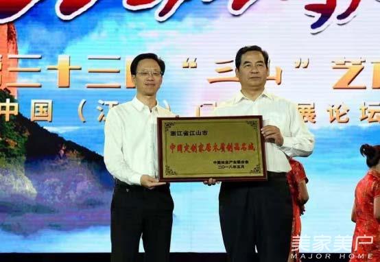 在10月12日的第三十三届“三山”艺术节暨中国(江山)门业发展论坛开幕晚会上,中国林业产业联合会副会长兼秘书长王满为江山授“中国定制家居木质制品名城”匾牌,江山市人民政府市长舒畅(左)上台接牌。