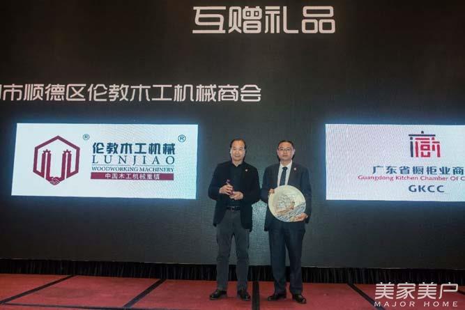广东省橱柜业商会常务副会长沈奕荣代表与佛山市顺德区伦教木工机械商会会长刘乐球互赠礼物