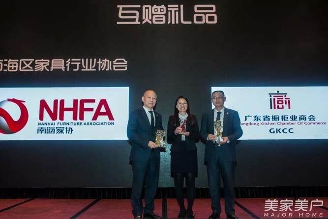 广东省橱柜业商会常务副会长沈奕荣、胡双喜代表与南海区家具协会秘书长李云互赠礼物