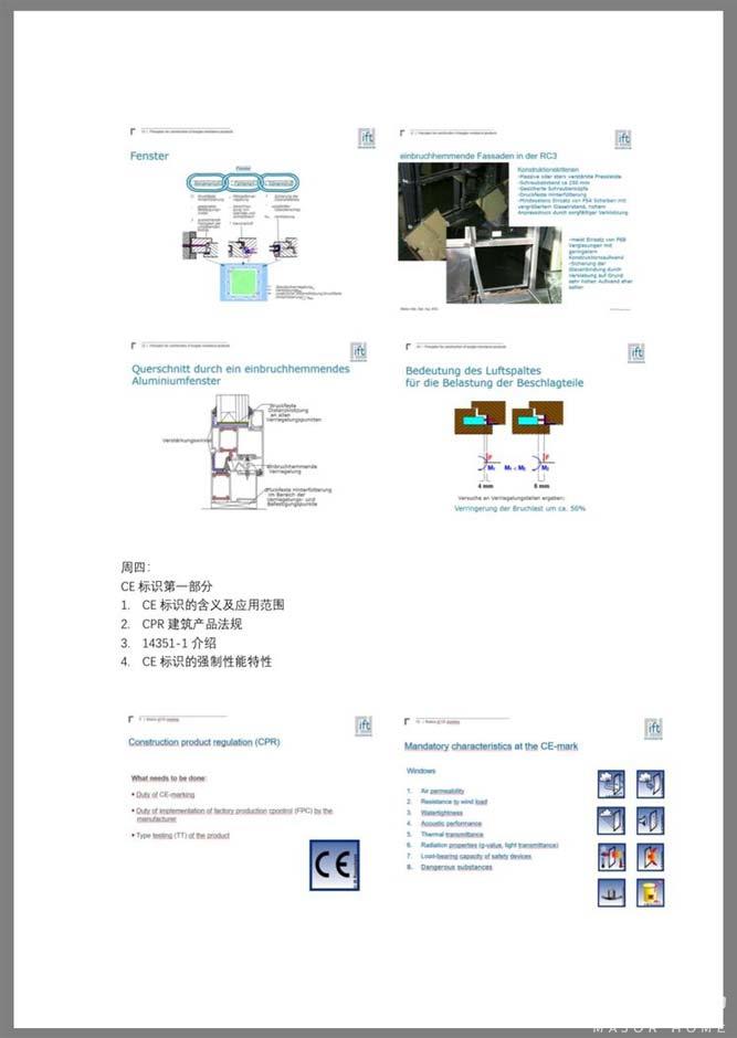 德国罗森海姆门窗幕墙技术研究院(简称ift) 同时ift也是符合标准的测试机构。ift可以进行产品认证,除了对门窗、幕墙、阳光房和安全玻璃(含配套产品)进行检测、认证和监督外,还提供质量管理体系认证,并可进行质量管理/环境管理/能源/职业安全和健康管理体系认证。2018年12月将举办的“德国门窗幕墙行业技术及法规研修班(专家级)”,该培训班由德国罗森海姆门窗幕墙技术研究院中国公司——洛森翰姆检测技术服务(上海)有限公司主办;北京中视蓝海企业策划有限公司承办;广州市福里事复合材料有限公司、上海研和门窗系统有限公司协办;广东省门业协会支持,该培训班将于2018年12月17-21日在佛山、12月24-28日在上海分别举办。面向门窗幕墙企业总经理、总工程师、设计人员,招生人数各50名,考试合格后,颁发IFT培训证书。
