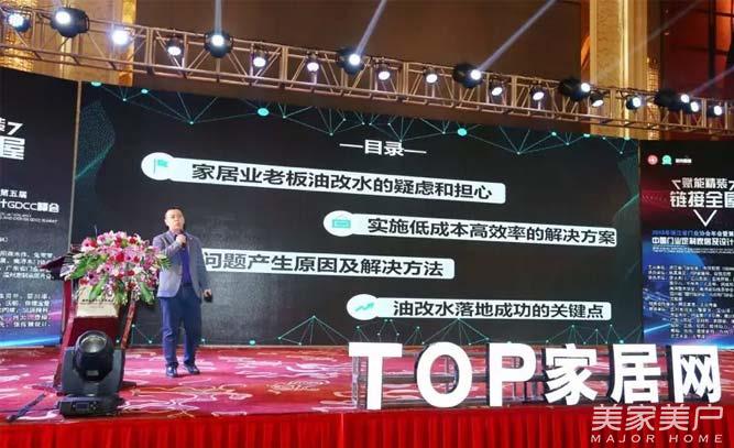 佳德宝曼水性漆总经理巩小虎上台主讲《家居企业油改水低成本高效率的关键之道》。他分别从家居业老板油改水的疑虑和担心、实施成本高效的解决方案、问题产生及解决方法、油改水落地成功的关键这四点,为大家解疑。