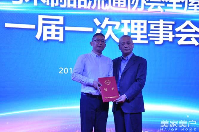 中国木材与木制品流通协会副会长兼秘书长李佳峰为新当选全屋定制分会秘书长李玉明颁发荣誉证书