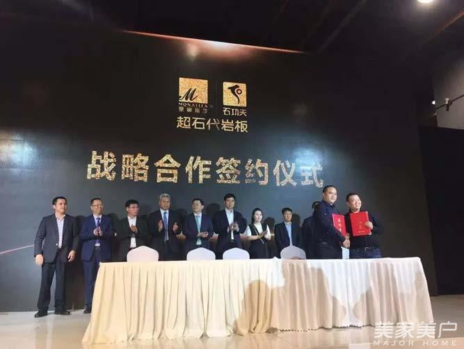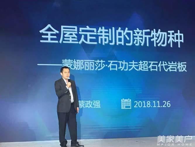 广东绿屋建筑科技工程有限公司总经理 蒙政强做主题演讲,介绍蒙娜丽莎·石功夫超时代岩板,岩板大型化是国际建筑陶瓷发展趋势,石功夫打造全国的智能化工厂,未来达到三四十种花色,且时代岩板具有耐高温、高耐磨、耐污染的三大性能,定制行业也将迎来新机遇。