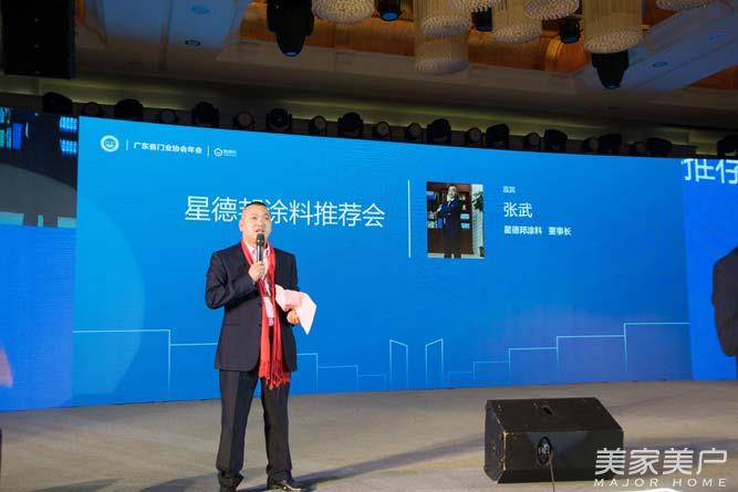在下午环节中,星德邦涂料董事长张武上台向与会嘉宾分享了星德邦涂料产品的相关介绍。星德邦涂料作为木门、家具、整装等企业的配套服务商,能够为企业提供一站式的环保涂装方案。星德邦新开发的环保油底水面新工艺,已受到广大用户的认可与支持,未来星德邦将继续努力推出更多更好的环保涂料产品,为众多合作伙伴提供更好的服务。”