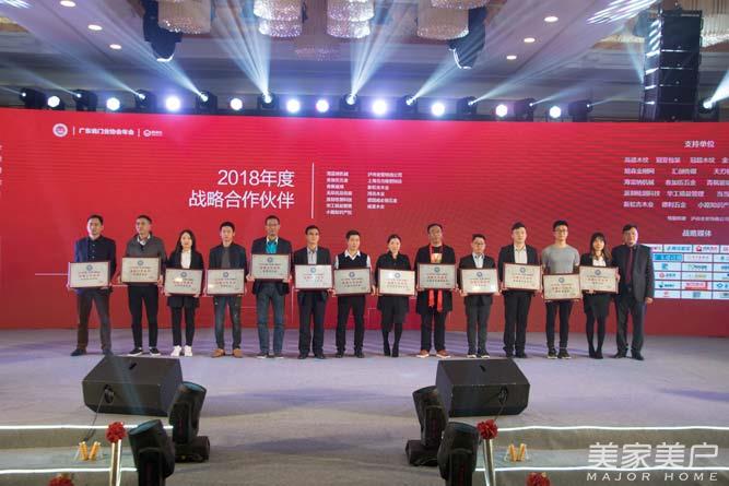 随后,参与大会所有赞助商分三轮上台,为广东省门业协会献上祝福语;广东省门业协会会长关润开为台上嘉宾授予“战略合作伙伴”荣誉牌。晚宴上,佛山市一品堂品牌策划有限公司董事长李万豪被授予“行业杰出贡献奖”殊荣。广州市梦工厂文化传播有限公司董事长王晔被授予协会“指定管理咨询机构荣誉牌”。之后,嘉宾对广东省门业协会年度新入会员进行了授牌仪式。