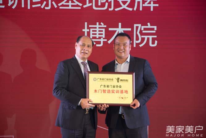 同时,星德邦涂料技术总经理龚振华在晚宴上带来星德邦涂料专题演讲。粤莱美胶条总经理余剑锋为大家带来主题分享。广东大园环保总经理何朋上台作“家具环保方案选择”主题分享。佛山市启健科技有限公司总经理王文雅上台作“一款属于全屋定制家居专业系统”主题分享。随后,广东省门业协会会长关润开上台为机械猫&博木院联合创始人黄唯授予“木门智造实训基地”荣誉牌。