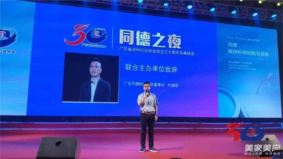 会议中,联合主办方——广东同德树脂集团总裁何锡恩认为,广东涂料企业,多年来一直跟随改革开放的步伐,率先引领行业革命和行业创新,今天是广东省涂料行业协会三十周年庆典的大好日子,广东省涂料行业协会30年来带领全省涂料上下游企业,学习进取、不断规范、做强做大、锐意创新,为广东涂料行业在全国乃至全球发展作出积极贡献,是广东涂料行业企业的好娘家。