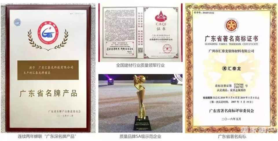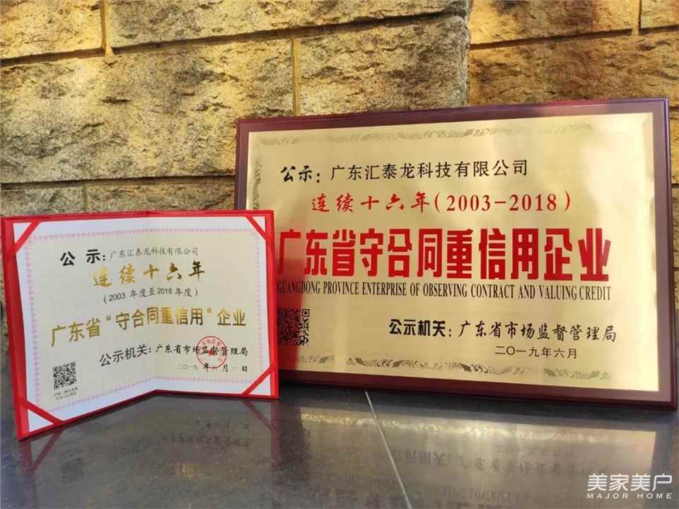 诚信经营,荣誉见证。23年来,汇泰龙因为守合同重信用,得到众多权威机构的认可,荣获“中国质量服务信誉AAA企业”、“全国建材行业质量领军企业”、“全国家居业“质量品牌5A级示范企业”、“全国产品和服务质量诚信示范企业”等荣誉称号。