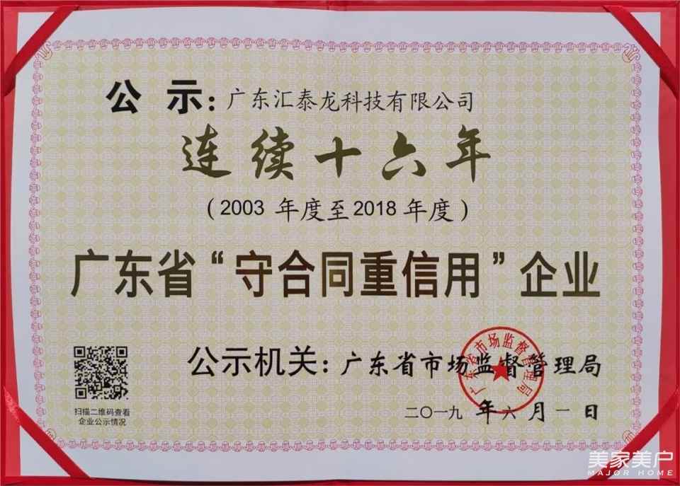 “广东省守合同重信用企业”称号是诚信企业的金漆招牌,是对企业信用的最权威评定。汇泰龙会继续以“诚”为本、以“信”为基,积极完善诚信体系,成为全球智能生活五金产业典范。