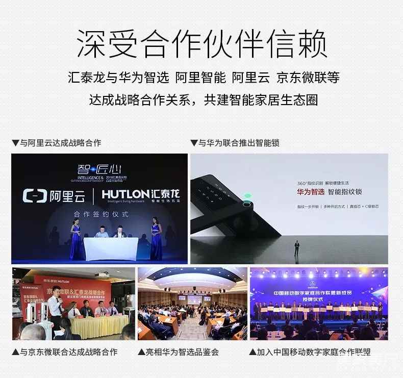 行业巨头,精诚合作。2016年,汇泰龙在传统的智能门锁基础上融入了云技术,率先行业推出能联网、能远程监控的汇泰龙安全云锁,并与各大行业巨头达成战略合作。