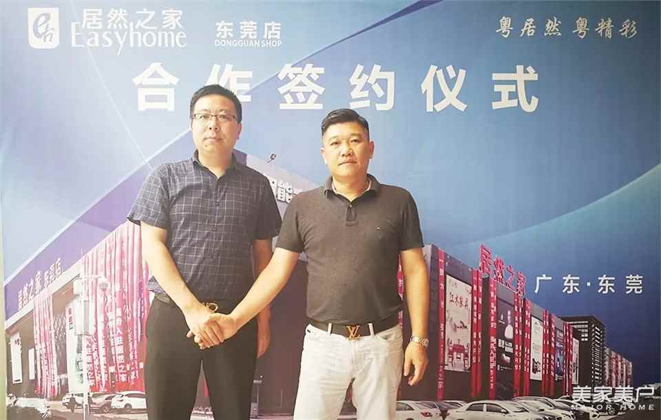 居然之家广东分公司总经理史友银(左)、派雅门窗董事长李钧洪(右)签约合影