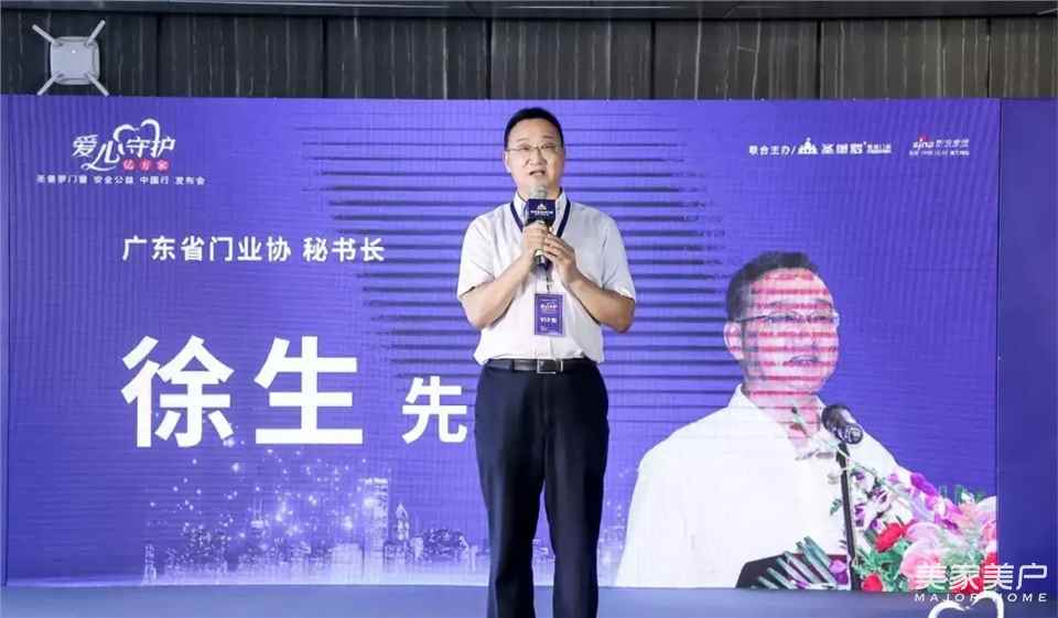 广东省门业协会秘书长徐生发表致辞:门窗行业应该重视产品的安全性,把产品回归到社会,回归到亿万家庭;防坠钢绳的研发,是圣堡罗门窗对社会的一个重大贡献。