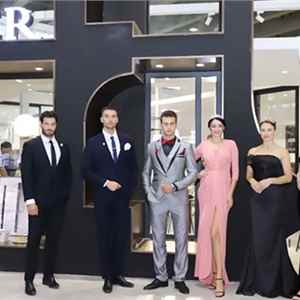 展台入口立面以古罗马时代的圆拱造型为主要风格,厚实的立面结构,黑色调墙面搭配金色镶边的手法,打造出时尚橱窗的效果。