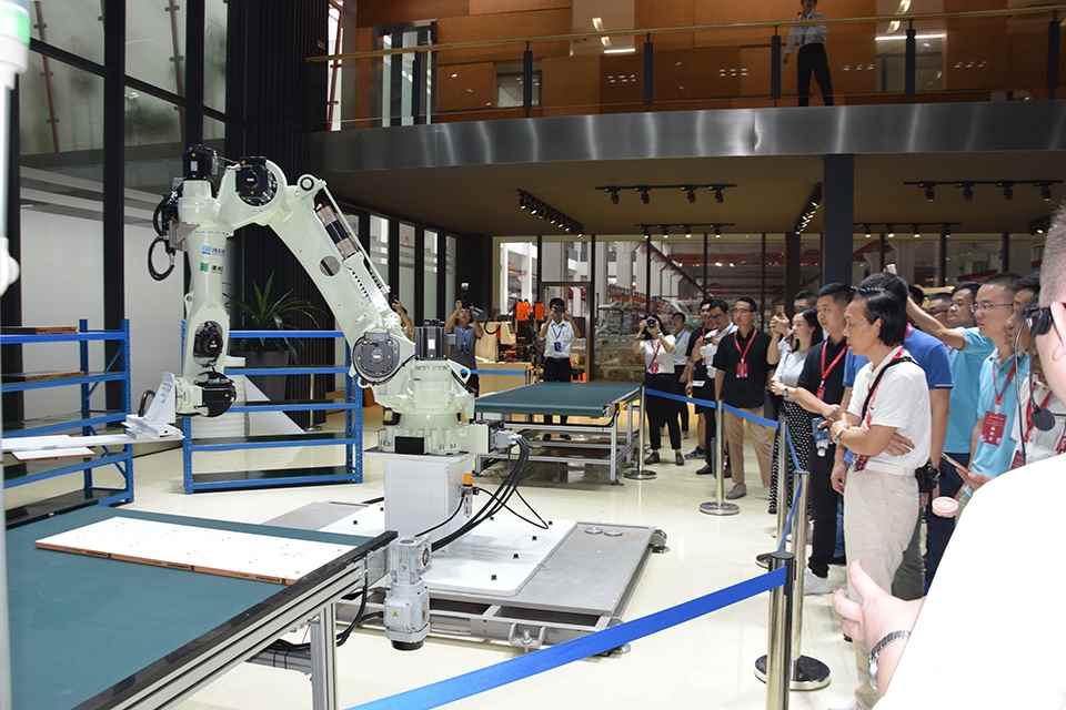 在新闻发布会开始前,主持人带领大家参观了南兴装备的工业4.0自动化生产工厂展厅,并在现场为大家详细的介绍了生产木工机械的流程以及最新技术。在南兴装备的展示生产线,可以看到数十种功能各异的自动化生产设备。在展厅内展示的智能机械臂、自动封边机设备和六面数控钻孔机械备受瞩目。