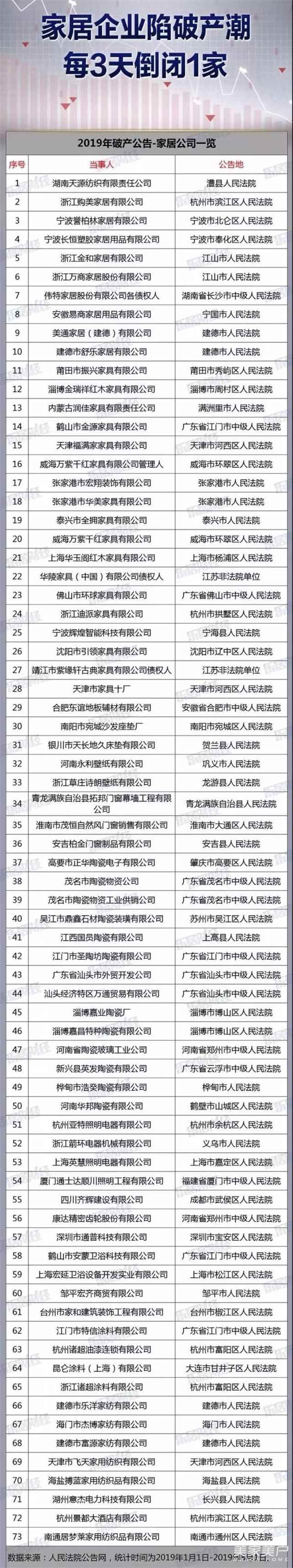2019年,倒闭态势延续,中小家居企业未能幸免。乐居财经记者根据人民法院公告网公开信息统计,截止8月1日,今年开年以来已有73家家居企业宣布破产,涵盖:家具、地板、壁纸、门窗、陶瓷、照明、卫浴、涂料、家纺等几乎全品类。