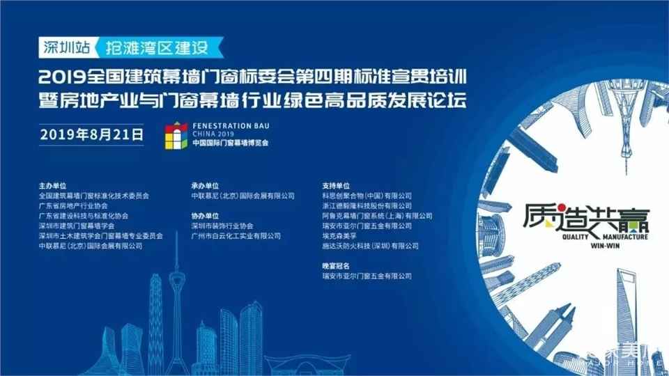2019年8月21日,由全国建筑幕墙门窗标准化技术委员会、广东省房地产行业协会、广东省建设科技与标准化协会、深圳市建筑门窗幕墙学会、深圳市土木建筑学会门窗幕墙专业委员会、中联慕尼(北京)国际会展有限公司共同主办,深圳市装饰行业协会、广州市白云化工实业有限公司协办的2019全国建筑幕墙门窗标委会第四期宣贯培训暨抢滩湾区建设—房地产业与门窗幕墙行业绿色高品质发展论坛在深圳隆重召开!