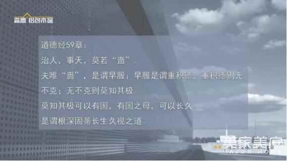 “夫唯啬,是谓早服。早服是谓重积德。重积德则无不克。无不克则莫知其极。莫知其极,可以有国。有国之母,可以长久。”这段话什么意思呢?早早地服从天道,不断地积德,就没有什么不能攻克的,我们的能量就没有边界,这样我们就可以担负治理国家的重任了。有了治理国家的原则和道理,国家就可以长久。大家要想基业常青,就要懂得“啬”。这和美国的那些管理大师德鲁克、柯林斯讲的道理完全一样。希望大家能够充分理解这个“啬”字。做企业,在顺境时不能骄傲自大,忘乎所以,把增长率做得过高;在逆境时我们要保持动作不变形,要坚定不移地实现增长目标。