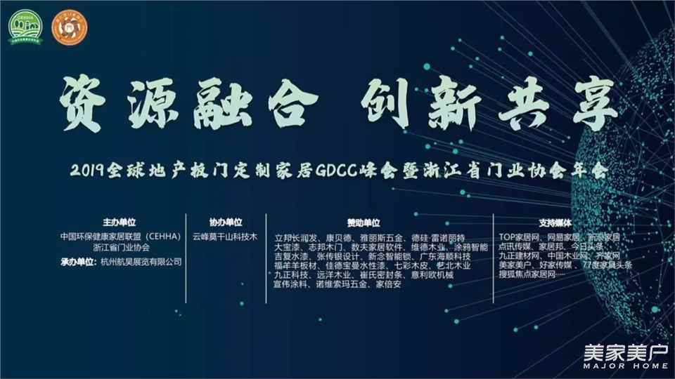 资源融合,创新共享!打造全球板门定制家居设计生态圈!2019年11月1日,2019全球地产板门定制家居GDCC峰会暨浙江省门业协会年会于中国浙江德清莫干山开元森泊酒店盛大召开。本届峰会由中国环保健康家居联盟(CEHHA)、浙江省门业协会主办,云峰莫干山科技木协办,杭州航昊展览有限公司承办。峰会的盛大举行得到了立邦长润发、康贝德、雅丽斯五金、德硅·雷诺丽特、大宝漆、志邦木门、数夫家居软件、维德木业、涂鸦智能、吉复水漆、新念智能锁、广东海顺科技、福羊羊板材、佳德宝曼水性漆、七彩木皮、张传银设计、艺北木业、九正建材网、远洋木业、崔氏密封条、意利欧机械、宣伟涂料、诺维索玛极简门锁、家倍安等企业的大力赞助。并得到全国多家协会的大力支持。TOP家居网、网易家居、新浪家居、点讯传媒、家居邦、今日头条、九正建材网、中国木业网、齐家网、伟德国际公司、好家传媒、77度家具头条、搜狐焦点家居网等行业主流媒体进行全方位现场报道。本届论坛主题为“资源融合,创新共享”,旨在通过汇聚融合创新资源,进一步加强定制家居产业链各企业间的合作,推动定制家居产业链的结构延伸,以及产业转型升级。数百家中外企业、定制家居、全屋定制、板材企业及上下游供应链企业,近百个高新技术项目参与,展示定制家居创新设计、环保升级、信息技术、跨界黑科技等,领先企业发展的先进技术以及产品。