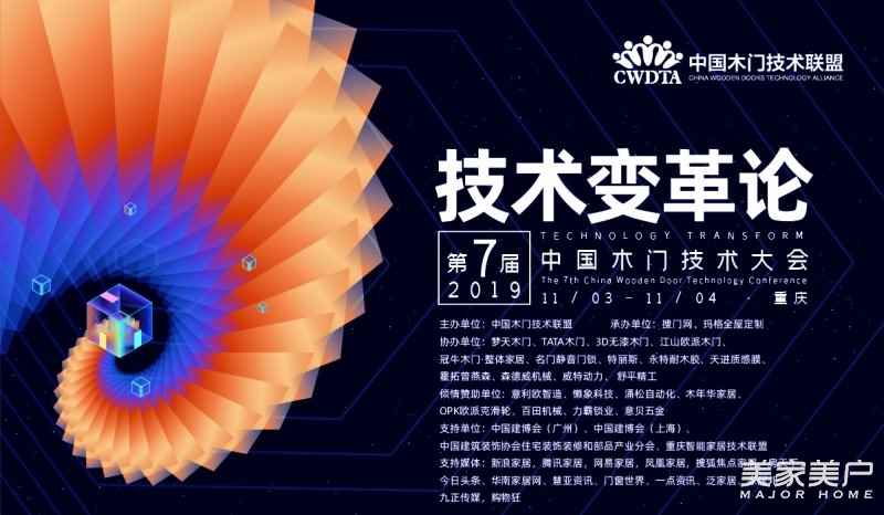 2019年第七届中国木门技术大会由中国木门技术联盟主办,搜门网、玛格全屋定制承办,梦天、TATA木门、3D无漆木门、江山欧派木门、冠牛木门·整体家居、名门静音门锁、特丽斯·森悦、永特耐木胶、天进质感膜、霍拓普燕森、森德威机械、威特动力、舒平精工协办,意利欧智造、懒象科技、涌松自动化、木年华家居、OPK欧派克滑轮、百田机械、力霸锁业、意贝五金倾情赞助。门业首席战略合作媒体搜门网、新浪家居、华南家居网、慧亚资讯、门窗世界、家居邦、九正传媒、购物狂等主流媒体提供媒体支持,中国建博会(广州)、中国建博会(上海)、中国建筑装饰协会住宅装饰装修和部品产业分会、重庆智能家居技术联盟提供支持。