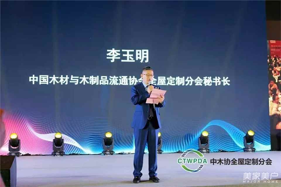 中国木材与木制品流通协会全屋定制分会秘书长李玉明在颁奖晚宴上致辞