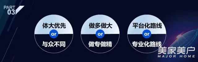 面对行业大势与市场新周期,家居企业普遍面临战略转型与模式升级,关键是要根据自身的资源和能力选择适合的战略升级方向。具体来看,可以从三个维度进行考量:1、要么体大优先,要么与众不同;2、要么做多做大,要么做专做精;3、要么走平台化路线,要么走专业化路线。