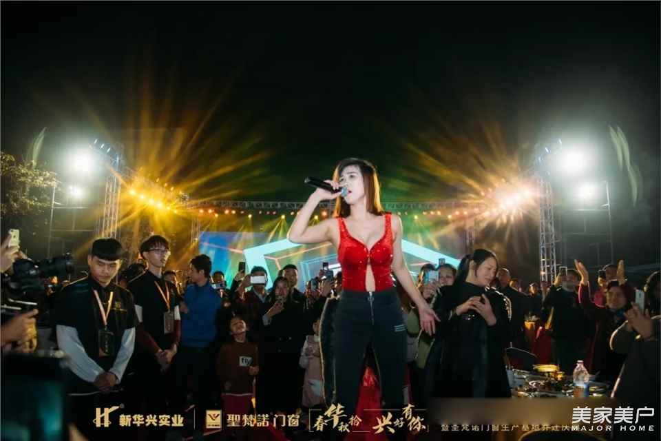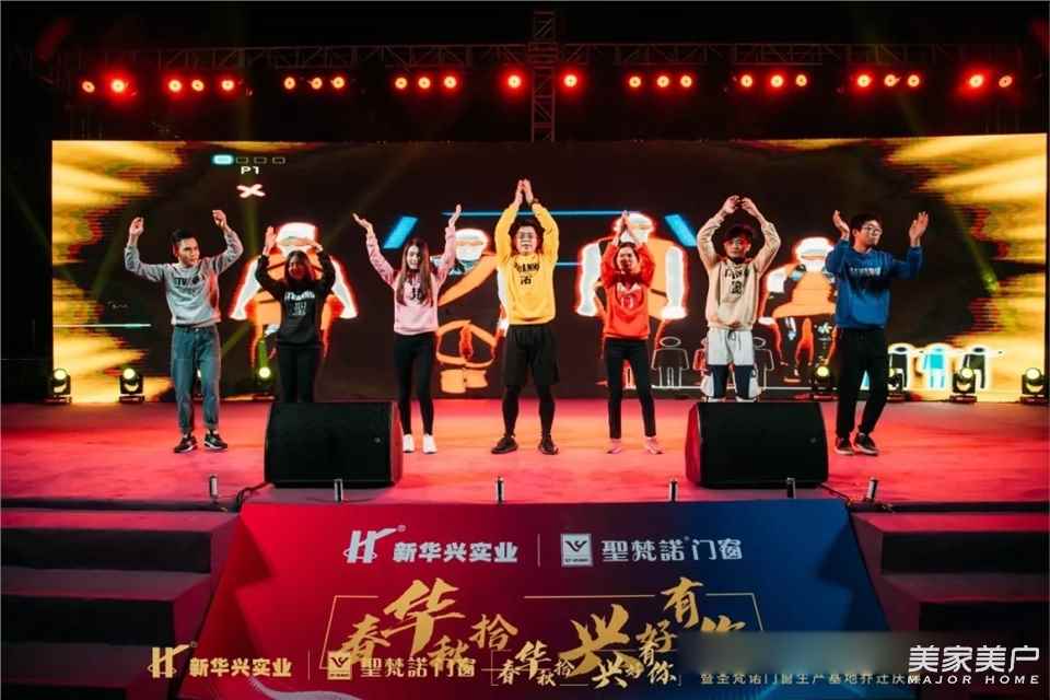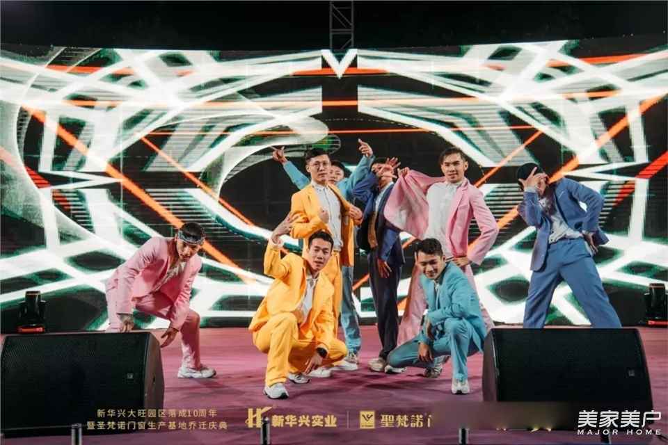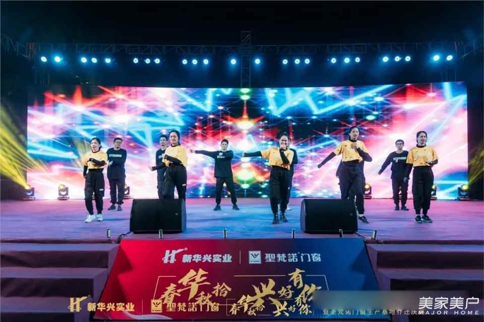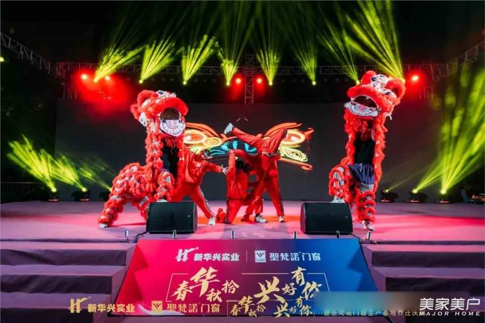 盛典现场,歌舞升平,欢乐齐贺。在现场一千多人大合唱《我和我的祖国》的嘹亮歌声中,庆典晚会正式开始。圣梵诺营销中心舞蹈《圣梵诺后生仔》、圣梵诺生产中心舞蹈《门窗使者》、新华兴同仁大合唱《明天会更好》,以及“金狮送吉祥”、“国潮街舞”、“厉害了,我的新华兴”等节目,精彩纷呈、欢声阵阵,特邀出席的中国好声音湖南赛区冠军、抖音超人气歌手胡濗小姐更是倾情表演、热力四射,穿插着现场一轮轮的现金抽奖,全场家人嘉宾热情互动,不断地把庆典的欢乐氛围推向高潮。