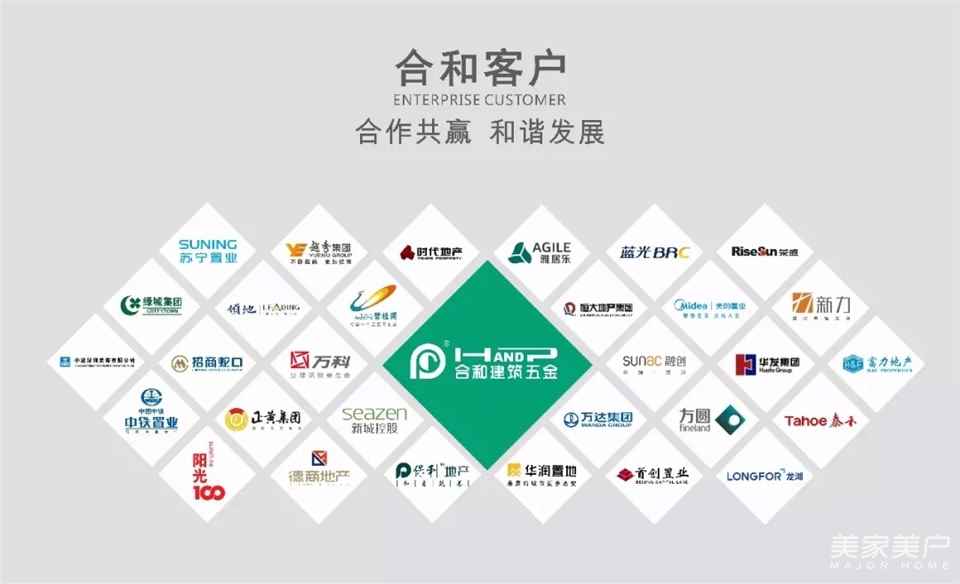 2019年至今,合和已先后和融创、华润置地、东原、大悦城、中城联盟、中洲控股、新城控股、领地、新希望、招商、荣盛、美的、绿城、绿地、蓝光等多家百强房企保持着稳定的战略合作关系,作为优秀的战略合作伙伴,合和将秉持匠心,一同再造顶级人居精品工程!