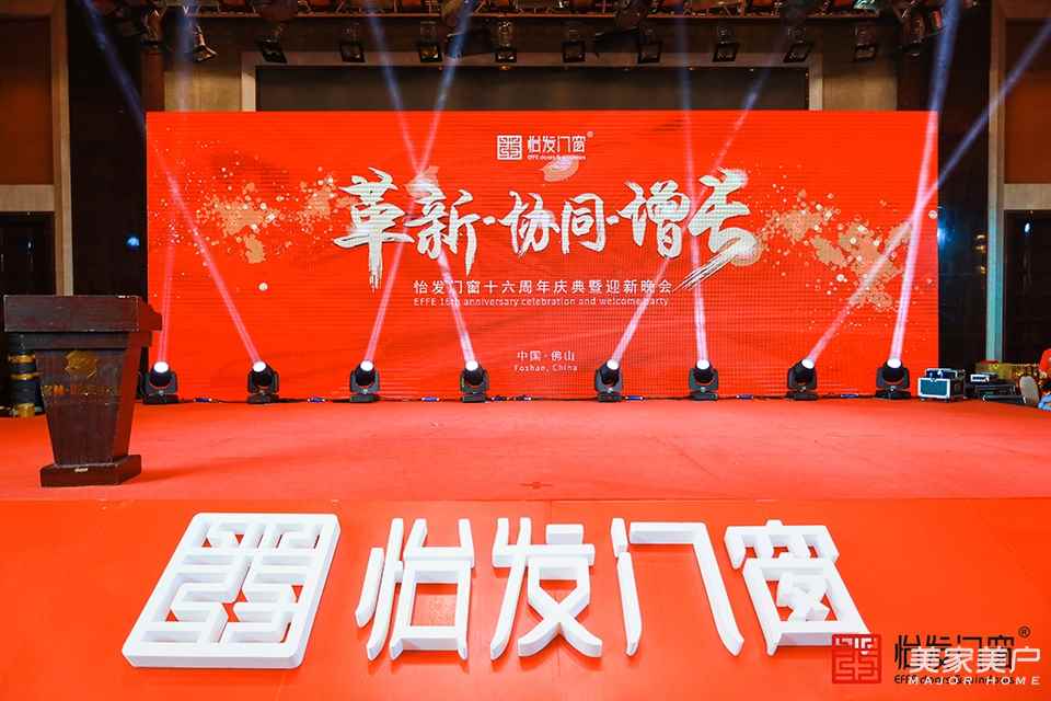 2020年1月6日,“革新·协同·增长”怡发门窗十六周年庆典暨2020迎新晚会在佛山富林朗悦酒店举行。怡发门窗董事长陈晓、总经理陈颖,嘉宾、合作伙伴、供应商,以及怡发门窗家人们齐聚一堂,共同见证了怡发门窗16周年盛会的举行。