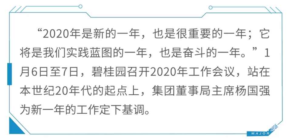 2020年,是碧桂园集团成立28周年。28年筚路蓝缕,劈波斩浪,风雨无悔。在征途再启的新年伊始,杨国强强调:“我们存在的意义和价值在于为社会进步、为人民生活得更好而努力。”他说,要永远守法守规,身体力行为社会进步而奋斗,要对得起业主、合作伙伴,对得起社会,只有这样才会得到社会的认可。