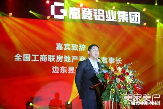 中国建筑系统门窗联盟副理事长兼执行秘书长、全国工商房地产商会副监事长边东昱上台致辞。边秘书长庆贺高登铝业集团35周年成立之喜,并祝愿高登铝业集团未来步步高登。